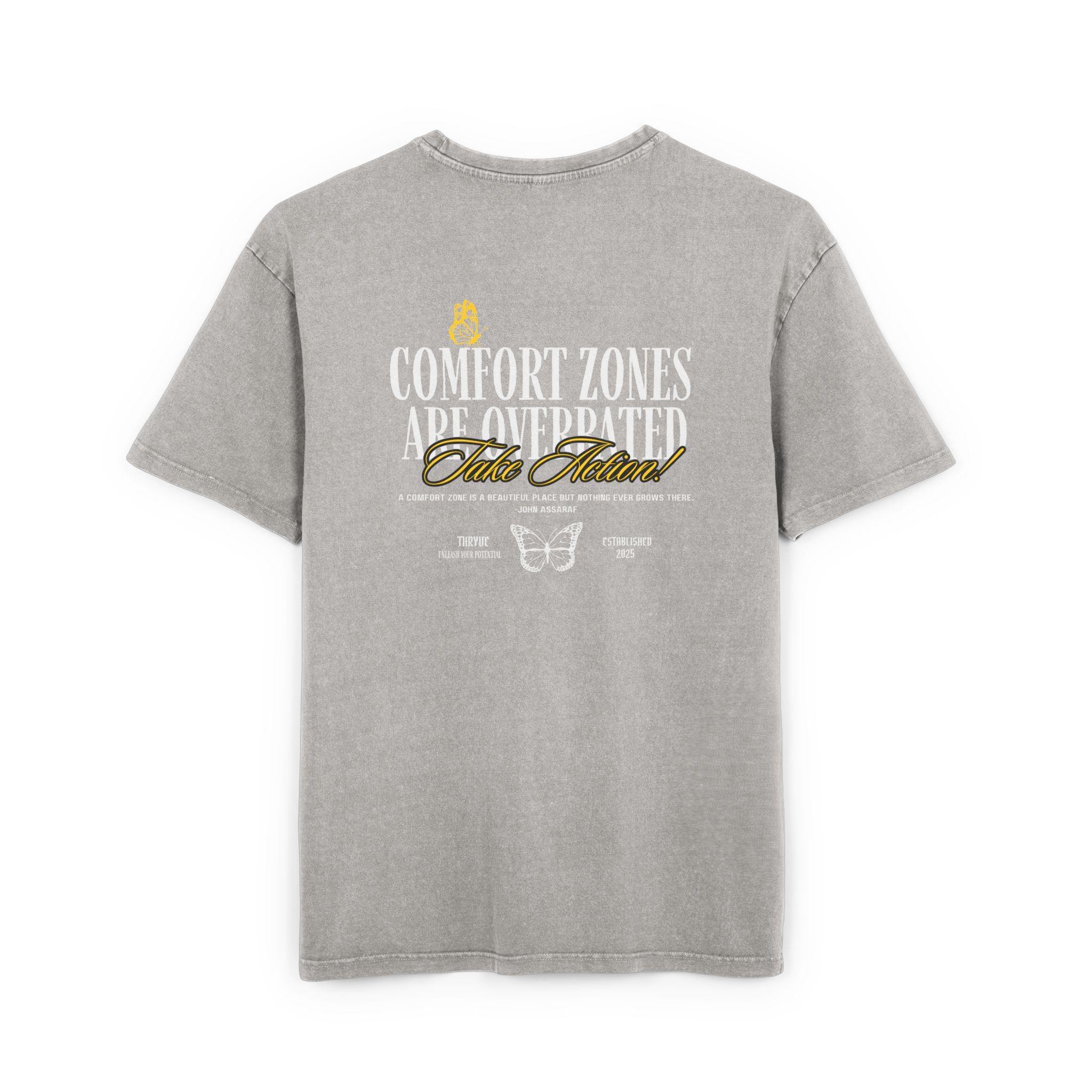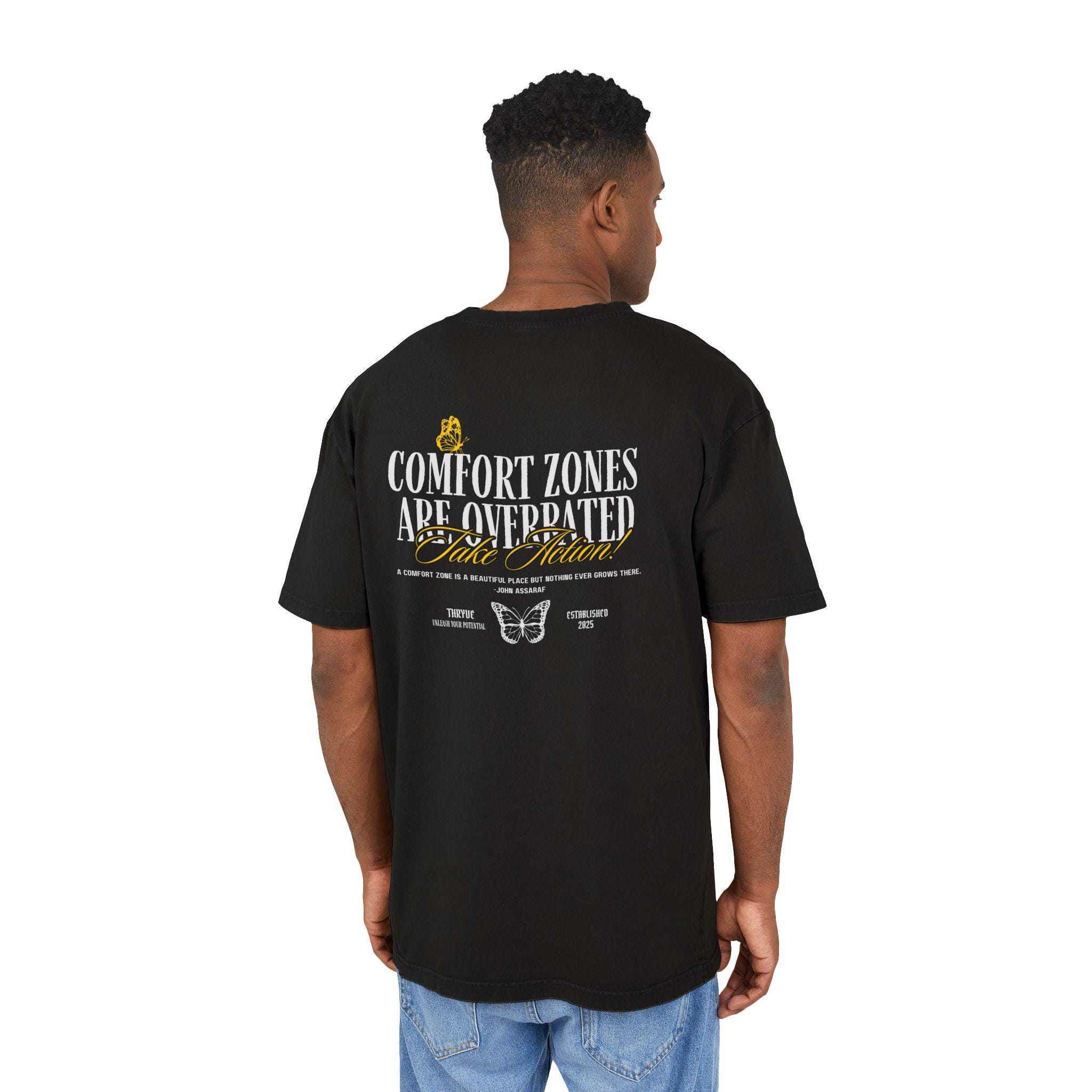 This oversized acid-washed tee feels like the slow, deliberate comfort of a late afternoon. Washed black with a subtle vintage fade, it carries a small chest emblem and a bold back print that reads “COMFORT ZONES ARE OVERRATED” layered with script and graphic accents. The medium-weight 100% cotton drape gives it structure without stiffness. Wear it when you want to move freely — tossed over workout gear, paired with relaxed denim, or layered under a jacket for a city walk. The look leans lived-in and intentional; it’s for people who chase small risks, collect stories, and value pieces that age with them.